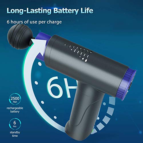 Lichtgewicht en oplaadbaar: de lichte body van het massagepistool vergemakkelijkt het voor de gebruiker om het op verschillende lichaamsdelen aan te brengen zonder snel moe te worden. Het maakt het apparaat ook gemakkelijk mee te nemen tijdens reizen. Het is uitgerust met een duurzamere hoogwaardige 2500 mAh lithiumbatterij. Een enkele oplaadsessie kan drie uur massagetijd geven. De oplaadbare lithium-ion batterijen in het stimulatorpistool geven het een lange levensduur. En kunnen snel worden opgeladen met opladen.