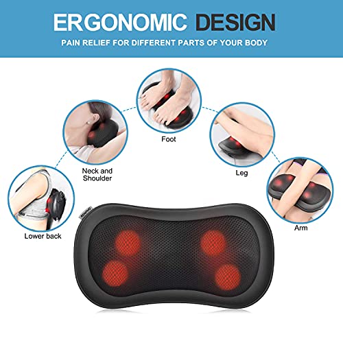 Shiatsu 3D-Massage-Ervaring: Met 4 krachtige diep knedende massageknopen en een versterkte verwarmingsfunctie helpt deze verwarmde shiatsu-kussen massager moeiteloos overbelaste strakke spieren te ontspannen en los te maken, wat je echt comfort en verlichting brengt. Uitgerust met een aansluiting voor de auto, kan je ook in de auto genieten van de perfecte massage-ervaring.